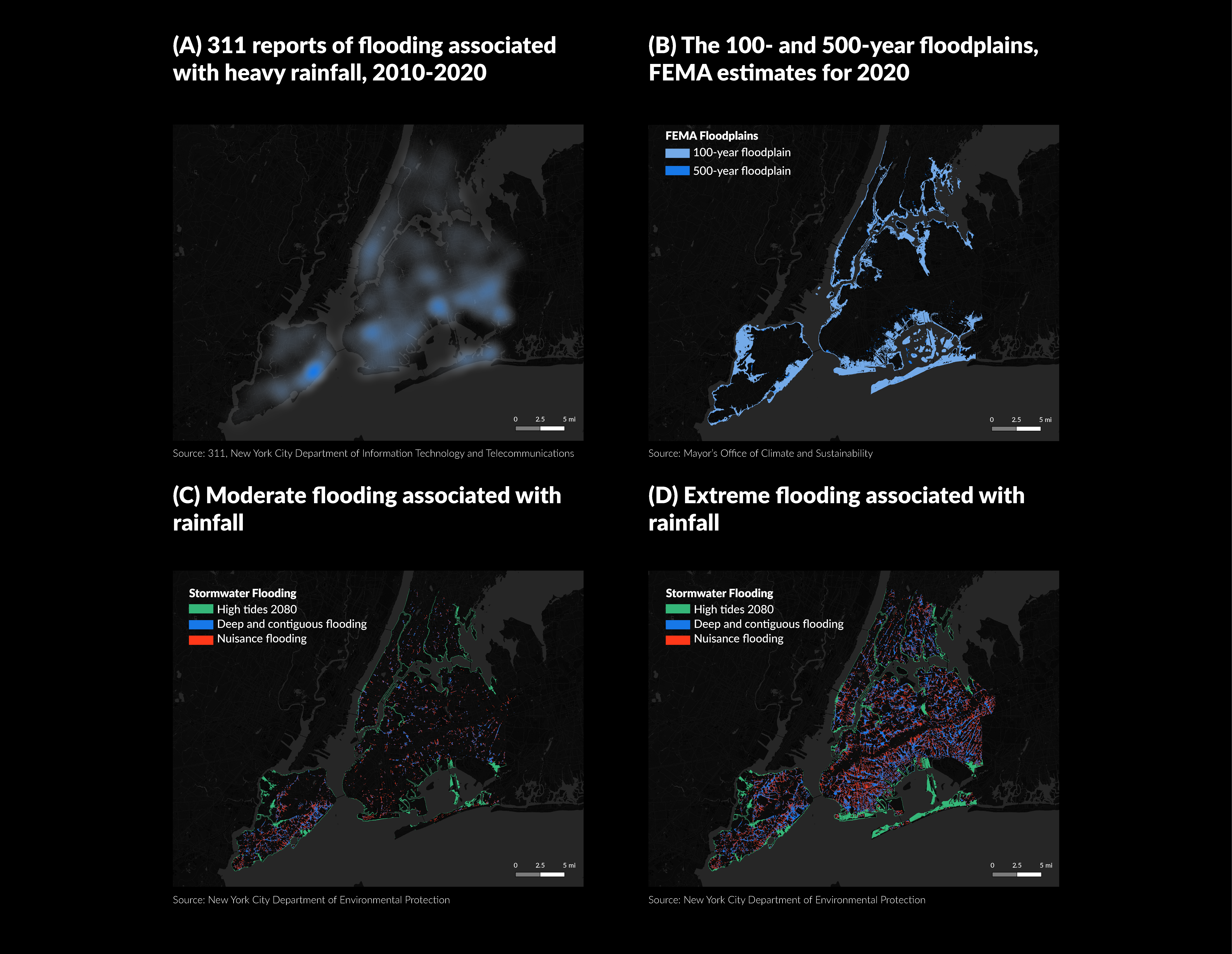(A) 311 reports associated with heavy rainfall come from the New York City Open Data Portal. The 311 reports of street flooding were filtered to include only street flooding that occurred on the same day or the next day after heavy rainfall. The heavy rainfall threshold is calculated as daily precipitation accumulation greater than the 75th percentile. This is a measure of perceived flood risk and is associated with both coastal and inland flooding. It is somewhat imprecise as there are many reasons why individuals might not report flooding.