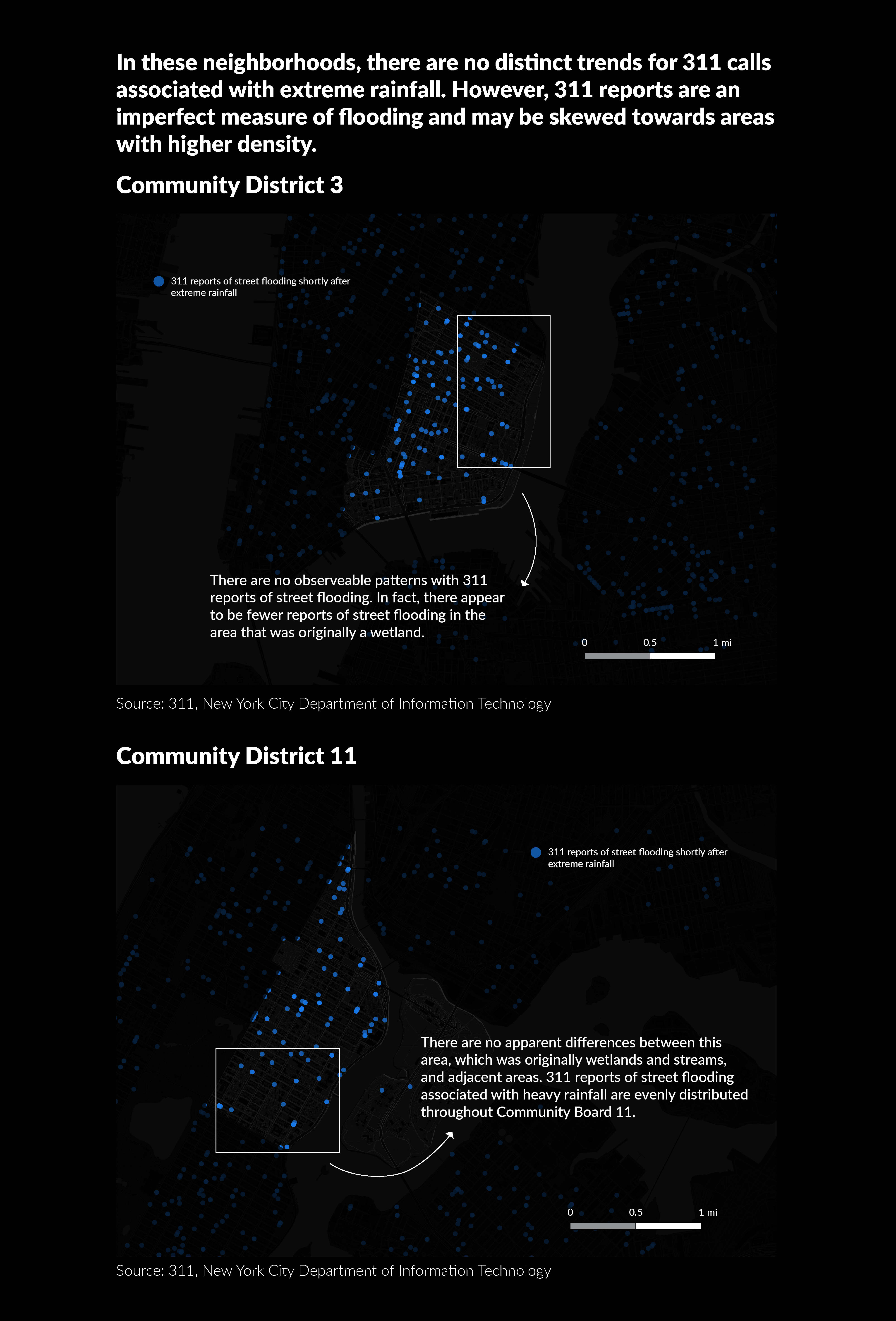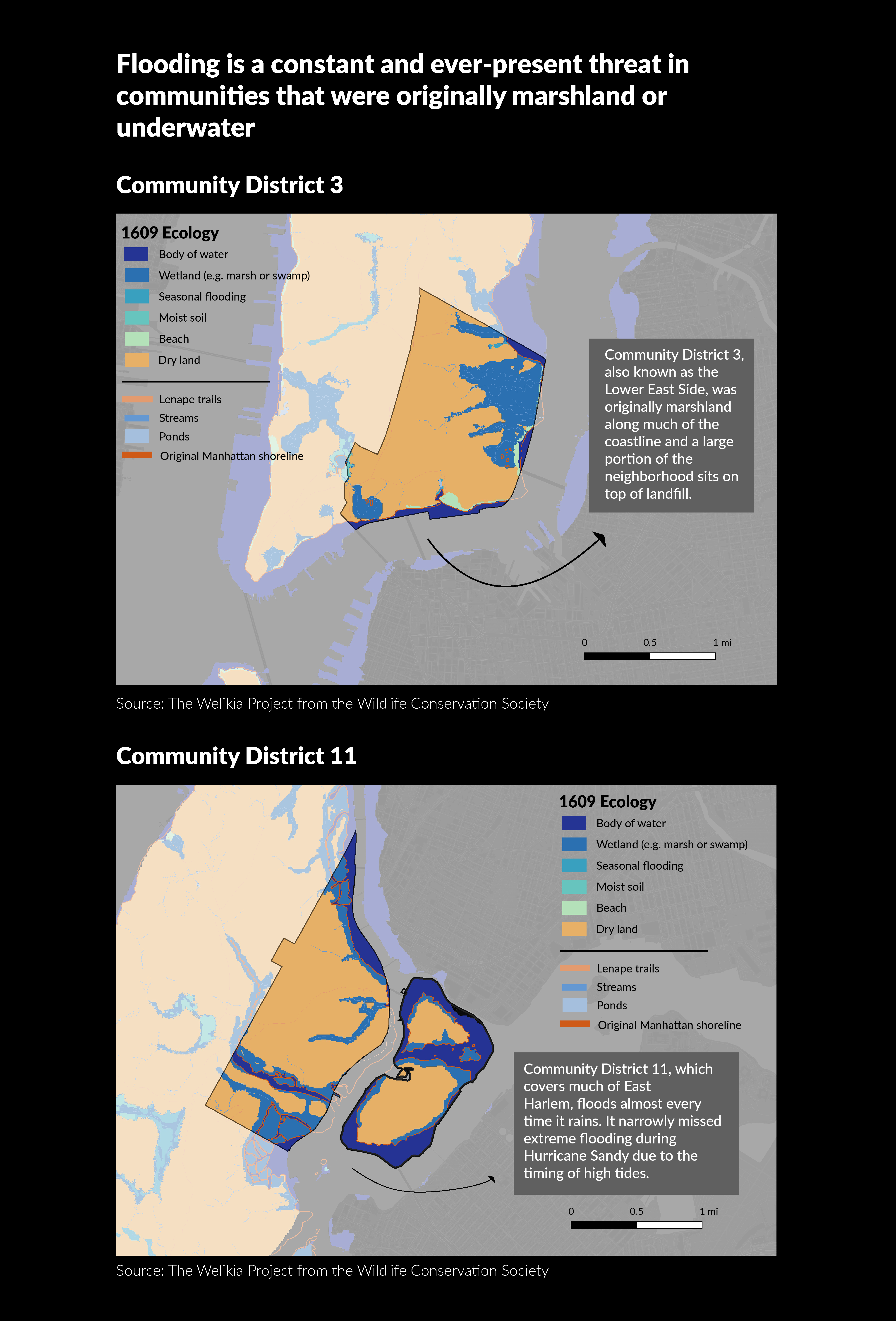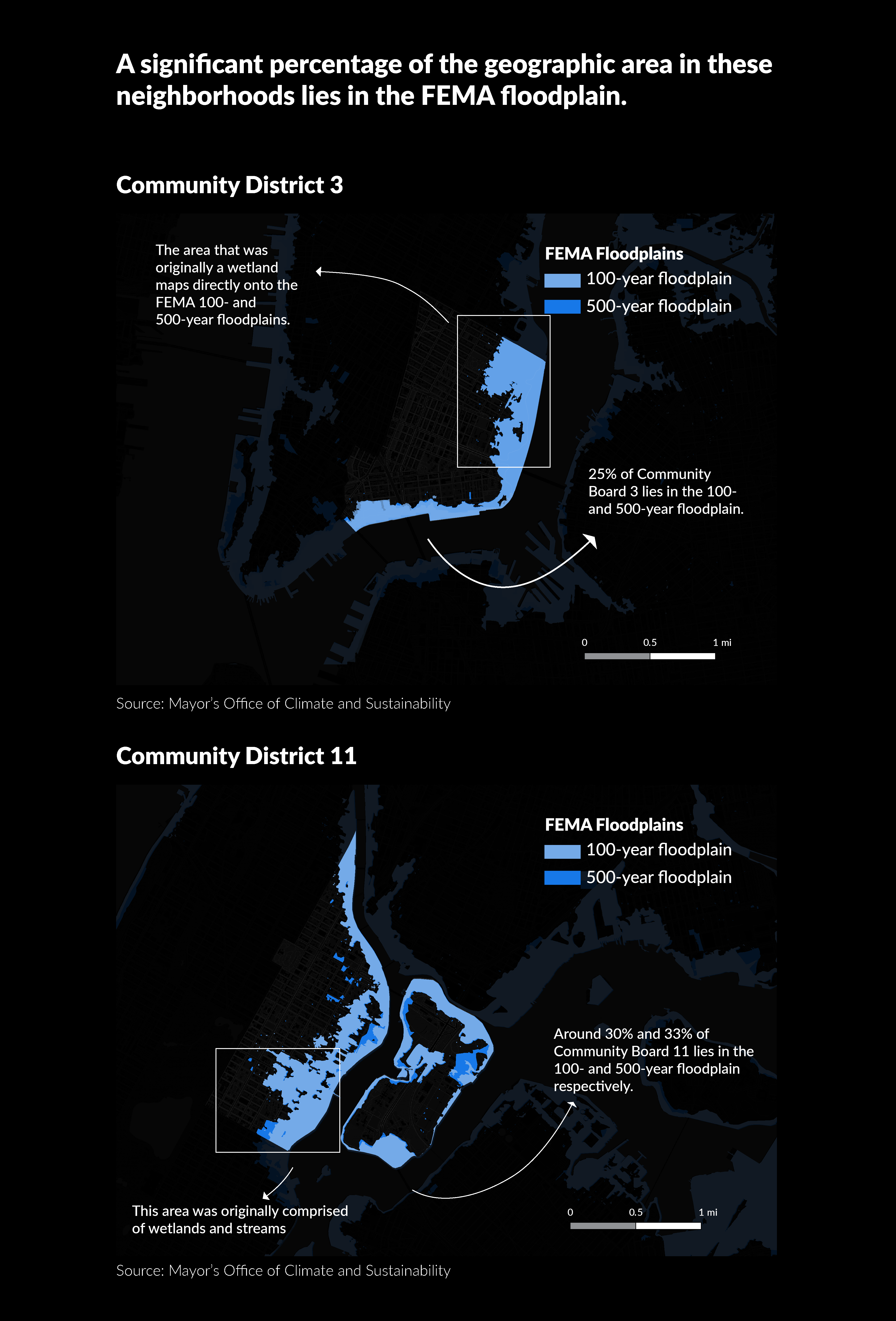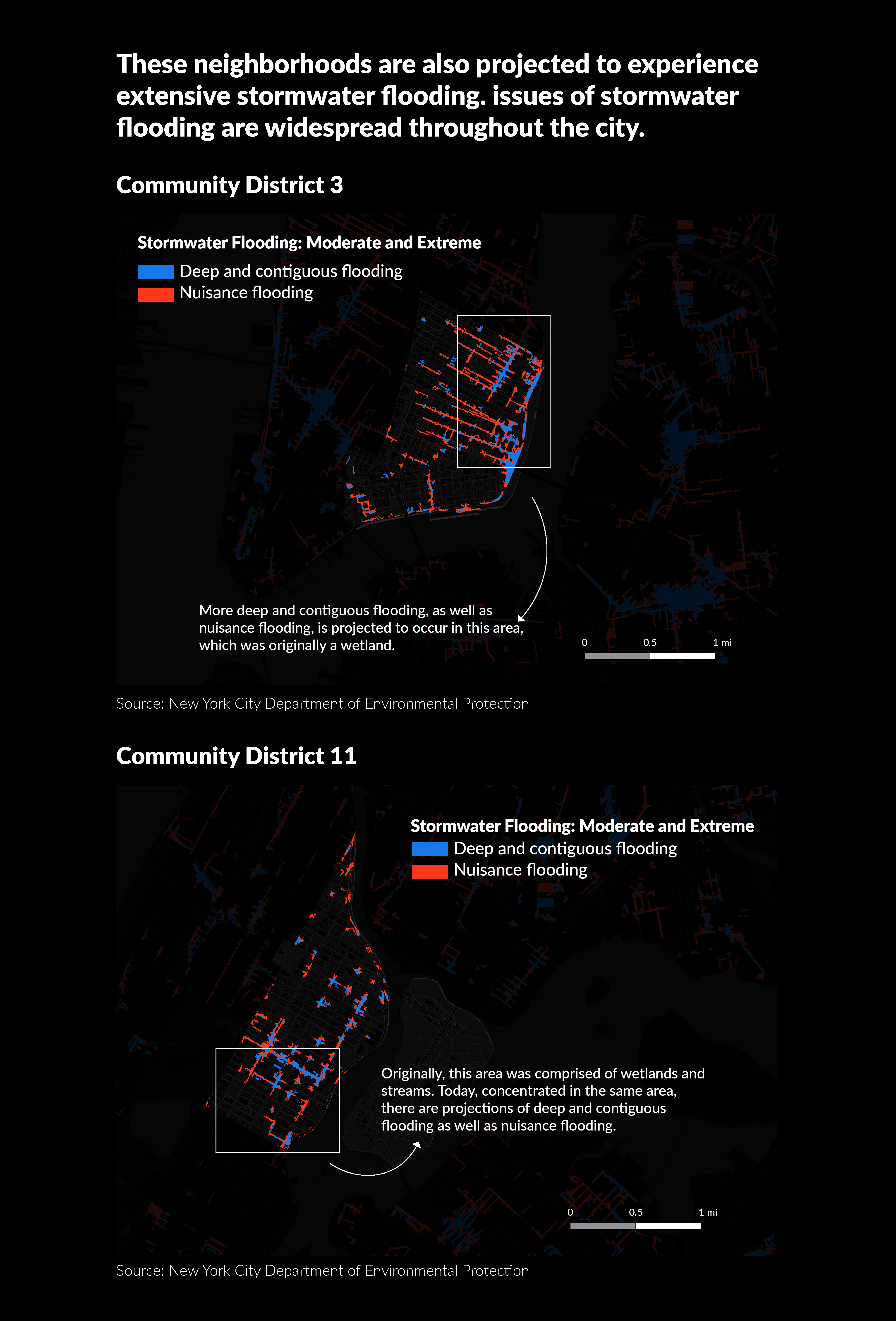 The following figures explore inland and coastal flooding in two neighborhoods, Community Board 3 and Community 11, where respectively 27 and 38 percent of the geography was either water or a wetland in 1609. In these neighborhoods, wetlands and water visually salign with current estimates of coastal flooding and stormwater flooding. Future work should expand this analysis to more communities, especially those inland that only experience seasonal flooding.