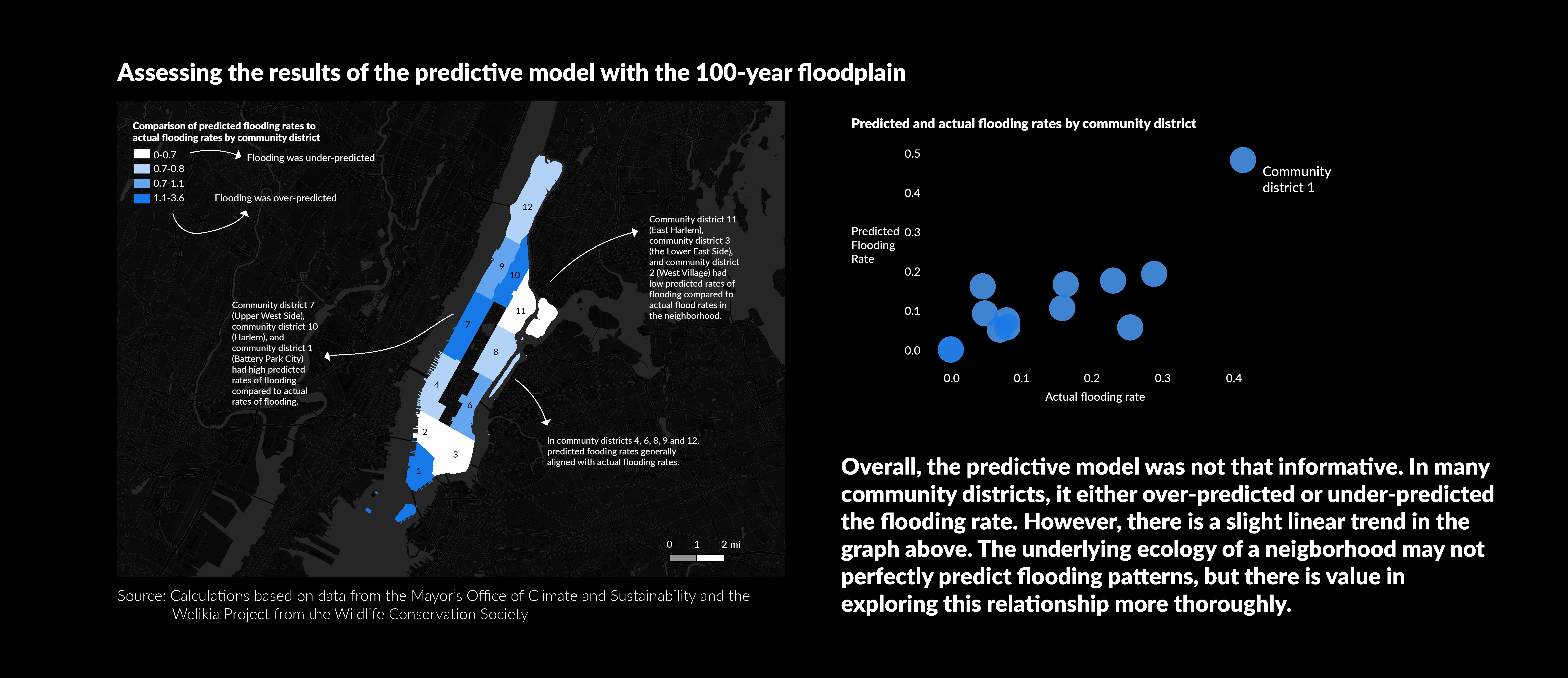 Comparing the predicted and actual rates of flooding by community district does suggest that for most areas the predictive model is only slightly off. However, the model did not work well for some neighborhoods, especially neighborhoods like community districts 3 and 11 where anecdotal evidence and reports from the city demonstrate a high risk of flooding.