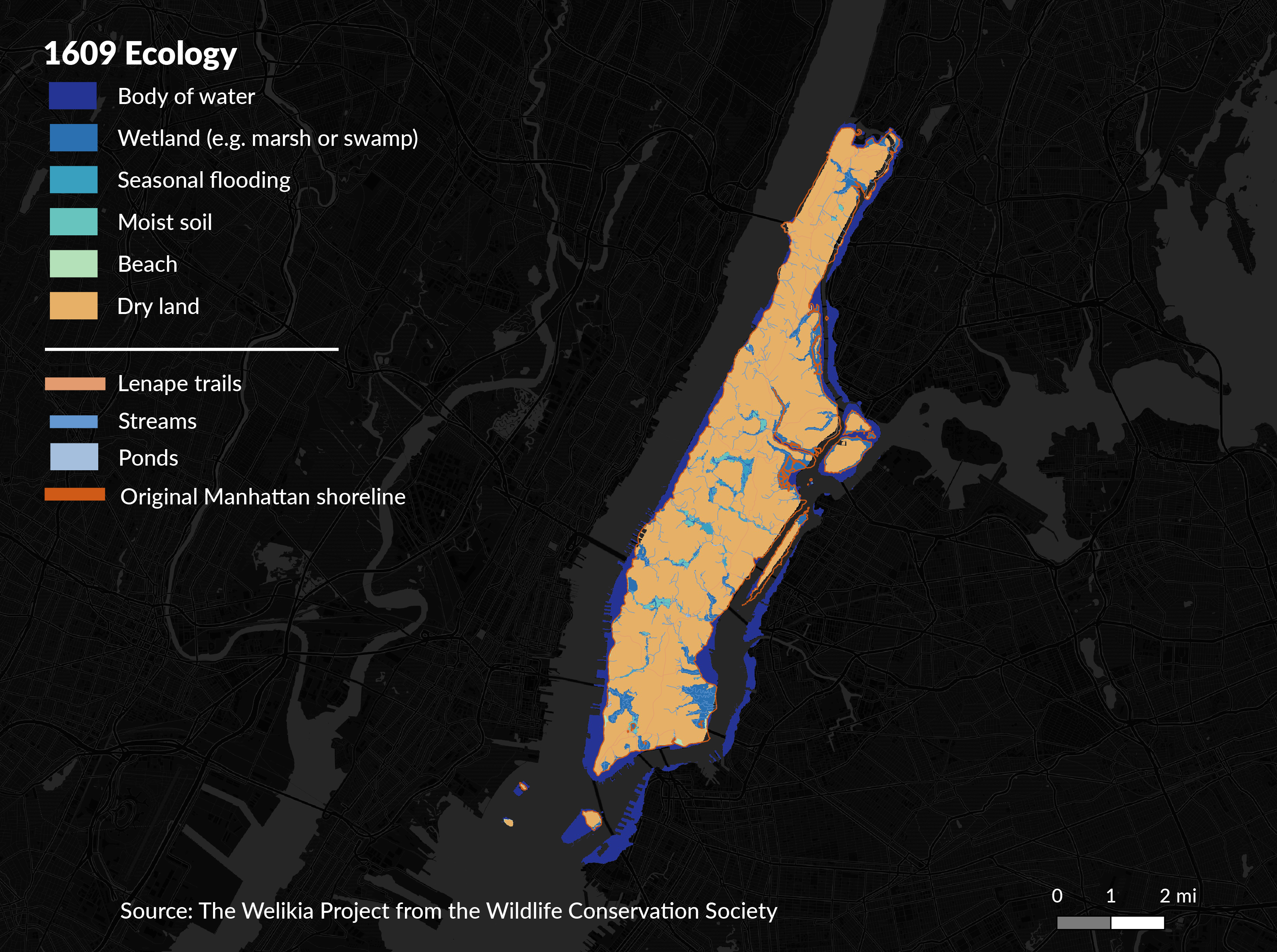 Maps based on these data are useful for showing what is no longer visible in the city: the underlying ecology. There are limitations since the maps, at the moment, only cover Manhattan and are imprecise at around 40 meters.